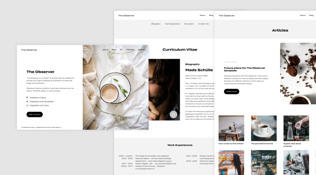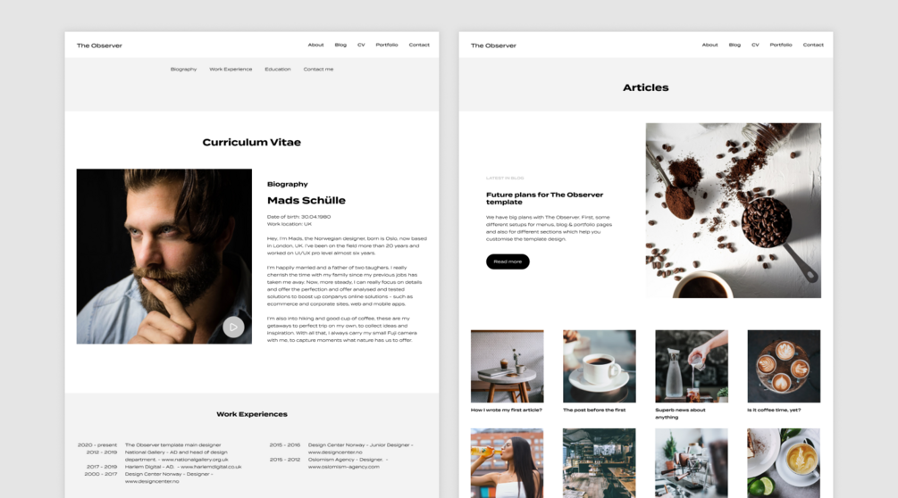 Observer theme contains most basic layouts such as About, Portfolio, Blog, CV and Contact.
